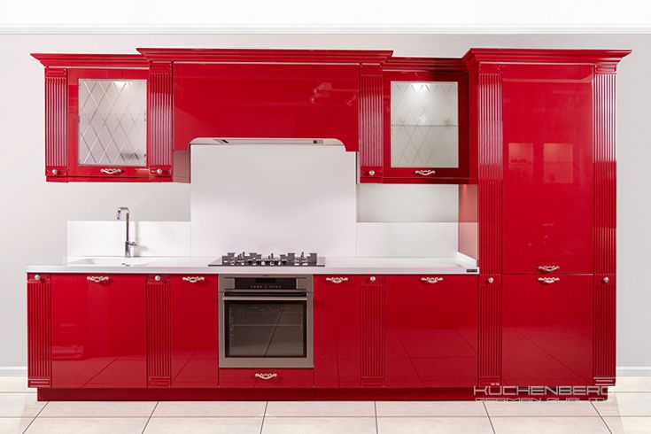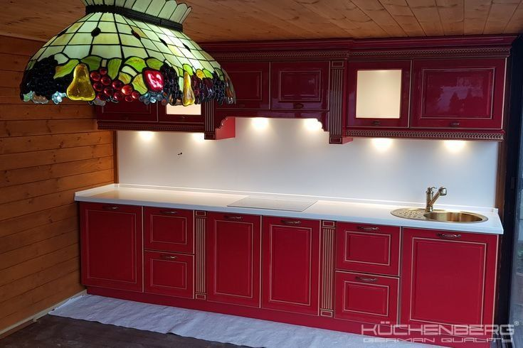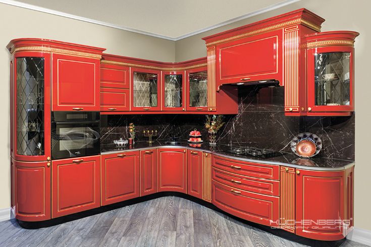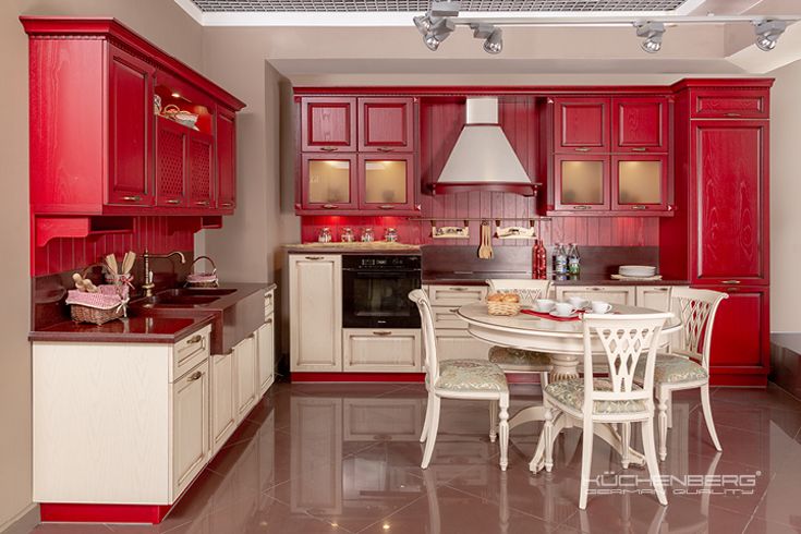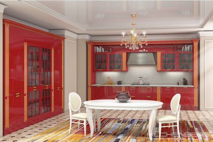 На классической кухне. Ярко-алая палитра не характерна для традиционных стилей. Лучше использовать благородные бардовые или приглушенные терракотовые оттенки. На фото дизайн красной кухни в классическом стиле выглядит изысканно и благородно.