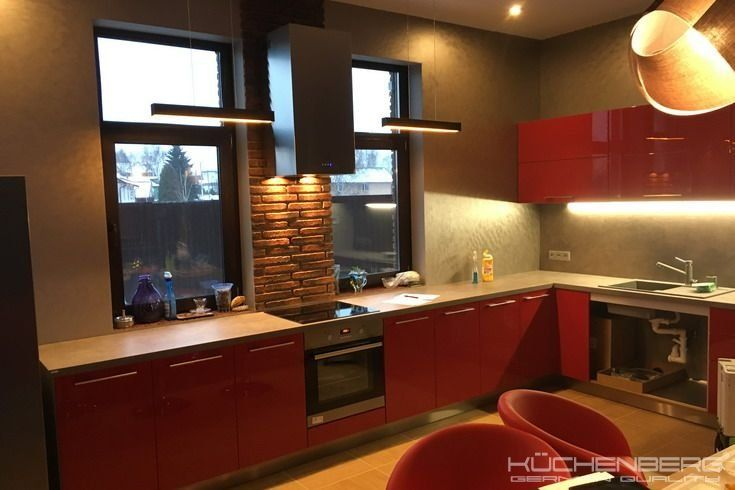 Освещение. Если кухня выполнена в современном стиле, то оптимальным решением станет использование точечных светильников и светодиодных лент. Выбор в их пользу позволяет не загромождать и без того яркую и броскую кухню лишними деталями. Использование люстры или настенных светильников допускается тоже, однако здесь важно помнить, что красный фасад является главным акцентом интерьера и все остальные элементы оформления должны соответствовать общей атмосфере, подчеркивать кухонный гарнитур, сочетаться с ним, иначе на выходе мы рискуем получить хаотичную и негармоничную комбинацию мебели и декора.