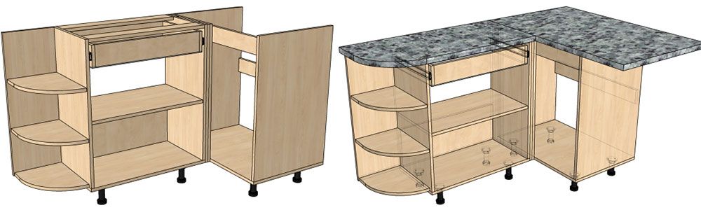 Теперь можно приступить к сборке нижних тумб. Для этого с помощью евровинтов соедините дно со стенками, установите верхние планки, проверьте диагонали конструкции и, если они различаются не более, чем на 5 мм, прикрепите заднюю стенку и ножки. Затем следует поочередно установить петли в гнезда, закрепить их саморезами, поставить вертикально тумбы, приделать к ним дверцы и ручки. На этом сборку нижних шкафчиков можно считать завершенной.